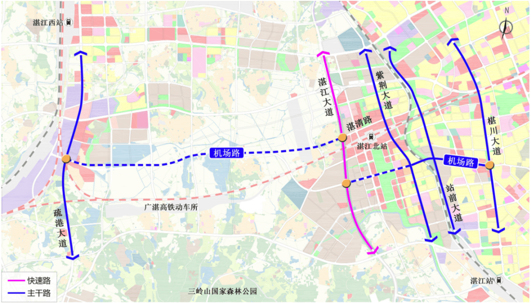 湛江北站作为粤西最大铁路枢纽,于2025年底投入运营,将带动高铁新城土地开发高峰。然而,现状霞山区西向交通仅依赖北侧湖光快线和南侧新湖大道,中部缺乏东西向直连通道,导致片区路网结构性失衡。机场路规划应运而生,其建设将有效分流市区东西向交通流,破解霞山老城区交通瓶颈。