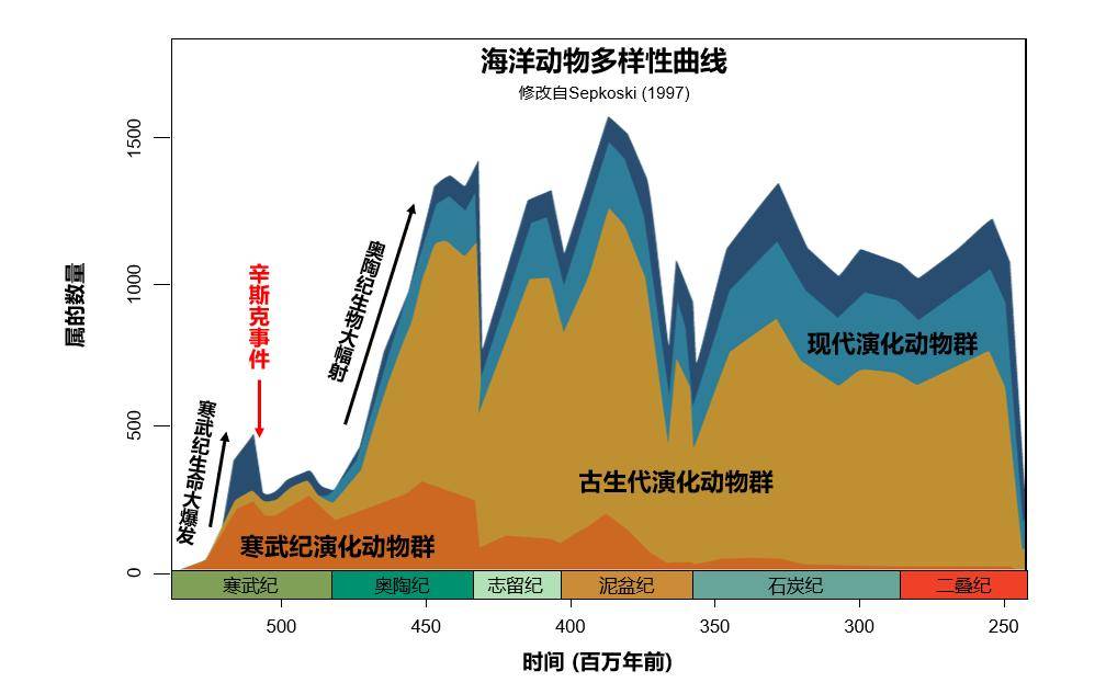 地球漫长的生命期分为隐生宙和显生宙阶段,大约在 5.39-4.87 亿年前,开启了显生宙的第一个纪元“寒武纪”(IT之家注:约 5.39~4.87 亿年前),这次地球-生命系统演化史上的伟大创新事件就是“寒武纪生命大爆发”。然而好景不长,在大约 5.13 亿年前,寒武纪生命大爆发被显生宙第一次生物大灭绝事件打断,这次大灭绝事件被称为辛斯克事件。